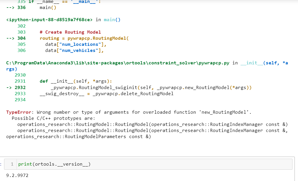 I am trying to run the ortools_pubcrawl.ipynb example from GitHub - GIScience/openrouteservice-examples: (Mostly) real-world examples and inspirations to use the , but I’m stuck at the first cell that uses ortools. Here is the error returned by executing that cell,