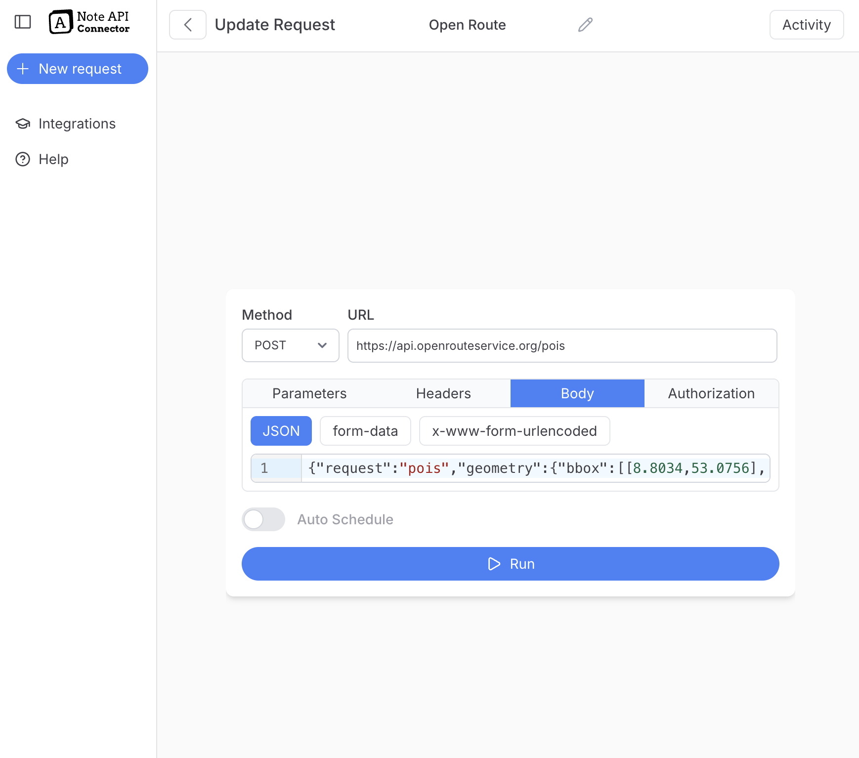 I ended up using the POIs API https://openrouteservice.org/dev/#/api-docs/pois/post and was able to sync the data into Notion using Note API Connector. Their Nested Selection feature https://help.noteapiconnector.com/customize-output/select-nested-data made it straightforward to map the POI fields to Notion database properties without needing any custom code.