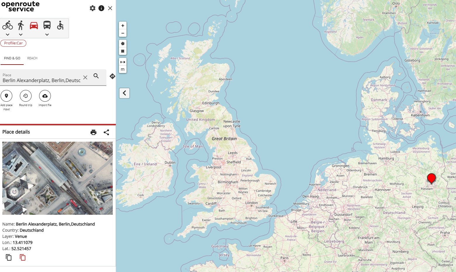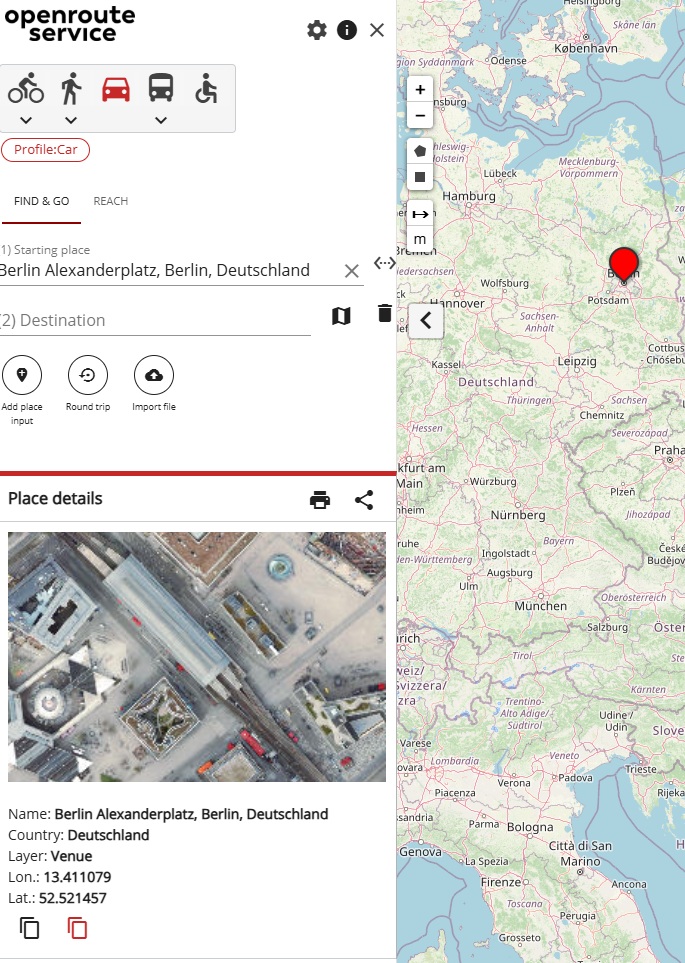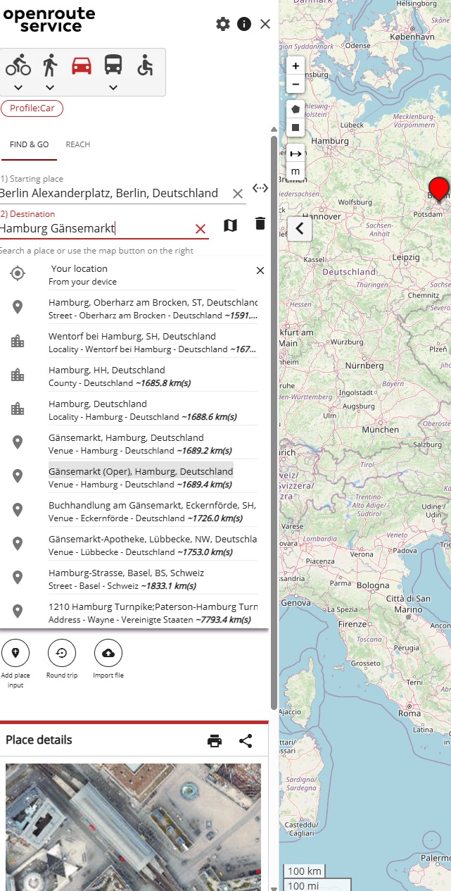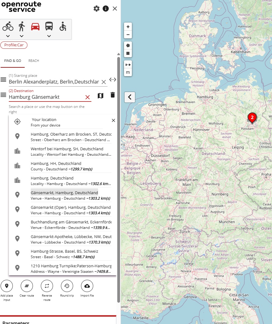 Let’s say I want to get the route from Berlin Alexanderplatz to Hamburg Gänsemarkt. My steps are: